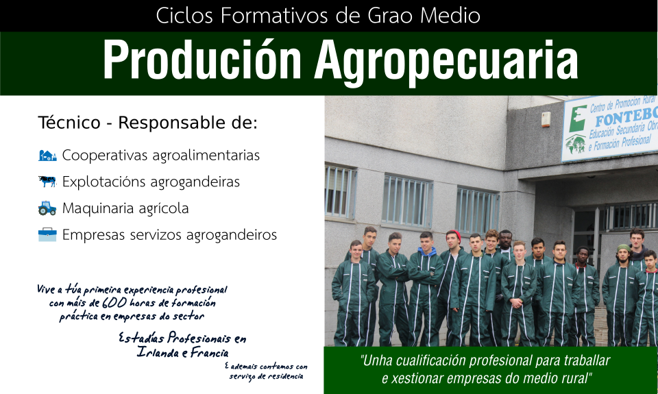 As competencias dun profesional do sector agrario son amplas e variadas. Desde Fonteboa tratamos de respostar a esas necesidades e en consecuencia, ademáis dos módulos específicos establecidos pola Consellería de Educación, impártense outros cursos específicos (idiomas Francés e inglés, Soldadura, Xestión Informática Ainfovac, Cursos de Benestar Animal, de Prevencios de Riscos Laborais etc). Isto é así porque consideramos que os titulares das explotacións e os novos técnicos agrarios deben ter unha capacitación e unha cultura que lles permita innovar, adaptarse aos cambios do entorno e a posicionarse de cara ao futuro.